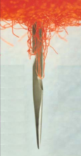 利用三角截面(或其它截面)棱邊帶倒鉤的刺針對纖網進行反復穿刺。倒鉤穿過纖網時,將纖網表面和局部里層纖維強迫刺入纖網內部。由于纖維之間的摩擦作用,原來蓬松的纖網被壓縮。刺針退出纖網時,刺入的纖維束脫離倒鉤而留在纖網中,這樣,許多纖維束糾纏住纖網使其不能再恢復原來的蓬松狀態。經過許多次的針刺,相當多的纖維束被刺入纖網,使纖網中纖維互相纏結,從而形成具有一定強力和厚度的針刺法非織造材料。